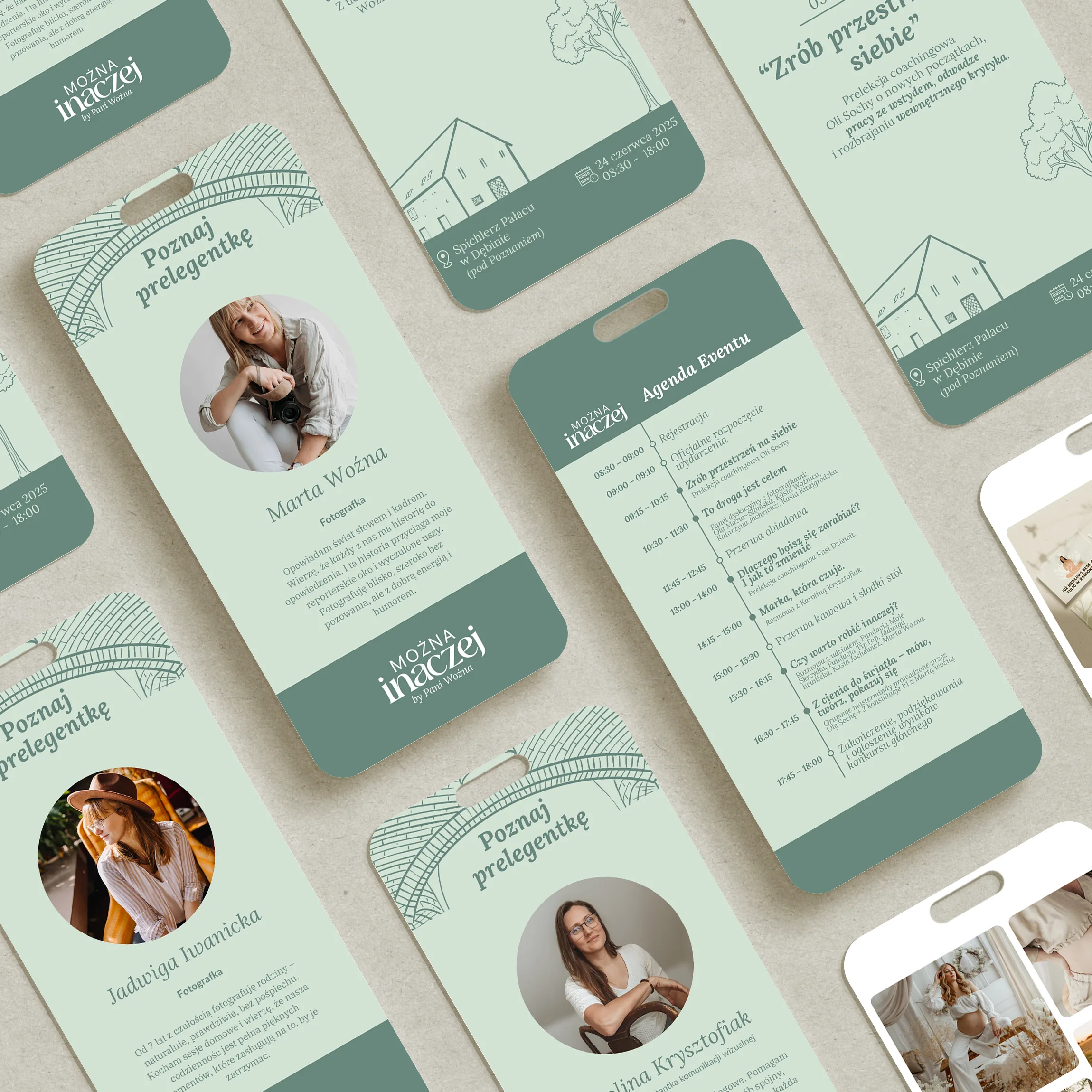 As part of the visual identity, we prepared the event logo, affirmation cards, promotional graphics for social media promoting the event itself as well as speakers and sponsors, table agendas, a large agenda board, tickets, a sponsor board, and gifts for participants such as notebooks, bag prints, and pencils.