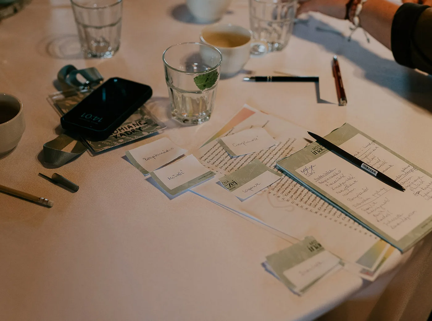 Drugą ważną częścią były materiały, które pomagały uporządkować przebieg wydarzenia na miejscu. Identyfikatory, agendy na stoły, duża tablica z agendą, bilety czy tablica ze sponsorami pełniły przede wszystkim funkcję praktyczną.